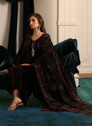 The Nensi kurta is a stunning piece, crafted from rich, sumptuous velvet that provides both comfort and elegance. Its deep wine hue creates a striking contrast against the subtle printed shawl. Adorning the kurta are delicate handworked details in gold and silver, adding a luxurious touch. The glimmering embroidery breaths life into the ensemble, providing a subtle sparkle that catches the light.