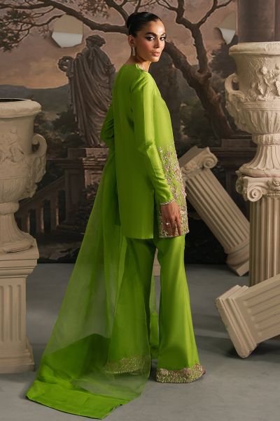 Reflecting the vibrancy of bold hues, Nerina is a spirited rendition of chic crafts. Cut from a grass green hue, the raw silk shirt and boot-cut pants feature exquisitely arranged pearls, crystals, and sequin floral patterns. Elevating the look further is the delicately adorned diaphanous organza dupatta, making this ensemble the perfect pick to celebrate any special moment.