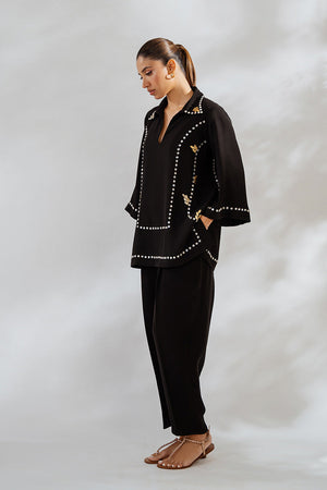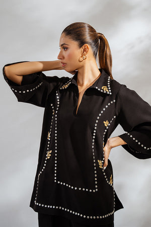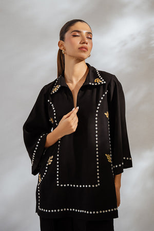 Glam meets comfort in Neris. An ebony Italian crepe set has iridescent diamond details embroidered along its exaggerated collar and structured hemline. The tapered shalwar polishes the alluring look.