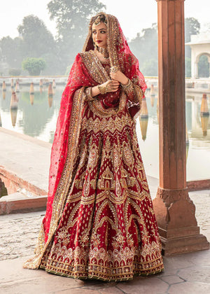 Description: Nigarbano is our signature sindoori bridal set that comprises of a raw silk lehnga choli extensively embroidered and composed using hand crafted embellishments of dabka, kora,sitari,pearl and marori. It comes with an embroidered and embellished dupatta finished with our signature chatta patti pallus and worn with a digitally printed silk shawl with hand embellished hammer work, dabka, pearl and gottaThis is a 3 Piece Stitched Bridal Outfit
