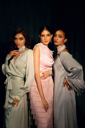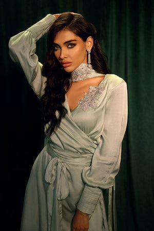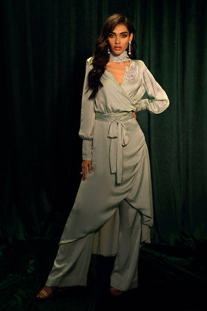 An eye-catching sea green silk open jacket with boot cut pants and pleated cuffed sleeves completed with embellished motif on neckline and belt to finish the lookShirt length: 51 Front depth: 8.6