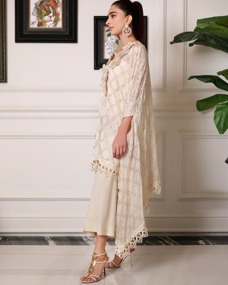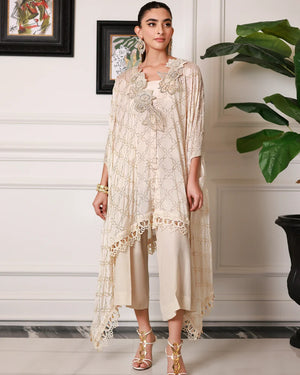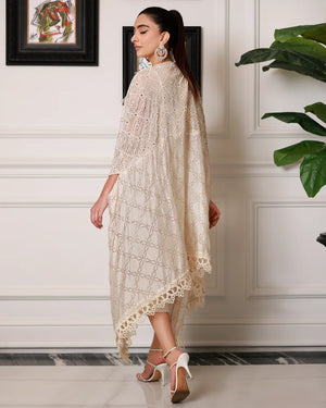 A mesmerizing ensemble featuring a fully handworked cape adorned with exquisite 3D flower embellishments on neckline.