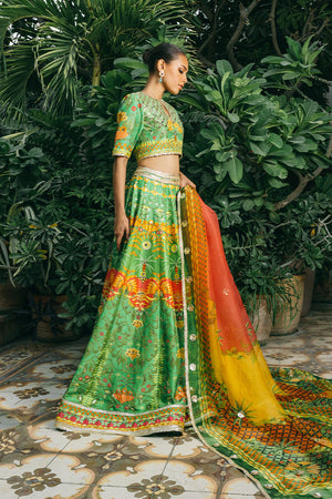 Divinely multi-hued, a festive print takes centre stage in a pure rawsilk lehnga choli. The keyhole neckline glistens in zardoze embroidery, complementing the gota web detailing on the choli and accents amplifying the print on the sweeping lehnga. Paired with a tropic-inspired organza dupatta with gota borders, be sure to pack this for your next destination wedding.