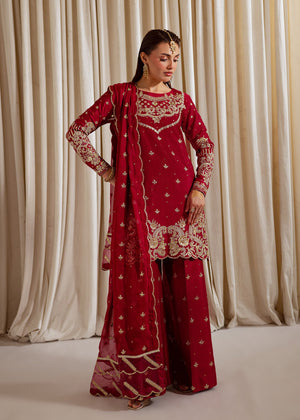 Nilofer - A Red raw silk tunic highlighted with alluring neckline made with tilla & Sequin, teamed up with palazzo pants that has similar intricate sequin work. Paired with a scalloped dupatta - heavy pallu borders that completes the look with effortless grace.