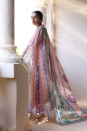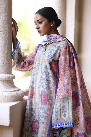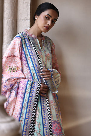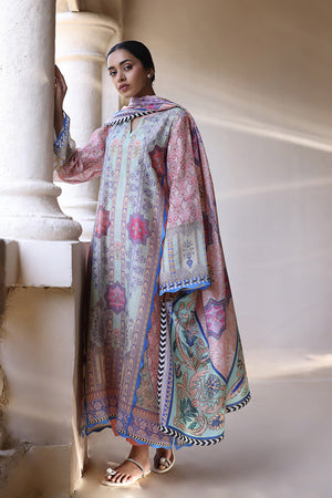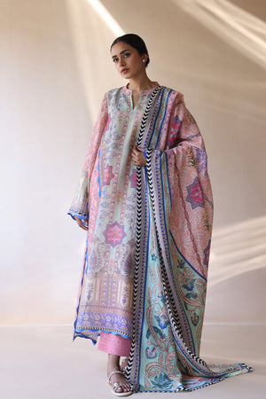 An elegant ensemble inspired by the rich heritage of East Asia, this powder blue and pale pink hued shirt is crafted from cotton net. The relaxed silhouette, adorned with exotic geometric trellises and a chinoiserie print has hand embroidered accents. Paired with a pale pink medium silk dupatta, showcasing intricate floral patterns framed by a monochrome chevron border, and candy pink pure raw silk culottes.