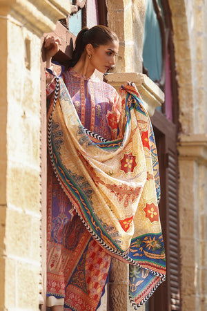 A vibrant ensemble inspired by the rich heritage of East Asia, this crimson and sapphire hued shirt is crafted from cotton net. The relaxed silhouette, adorned with exotic geometric trellises and a chinoiserie print has hand embroidered accents. Paired with a saffron toned medium silk dupatta, showcasing intricate floral patterns framed by a monochrome chevron border, and matching cream pure rawsilk trousers.