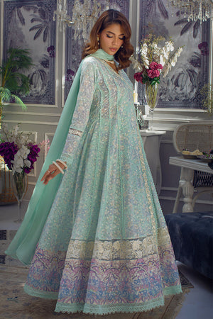 Super pretty Icey blue with fresh hues of blues and lilacs in a digitally printed signature schiffli in forever classic and favorite angrakha kalidaar silhouette. Filled with floral and scalloped details. Adorned with feminine chic laces and embellished with sequins embroidered borders and details. The ensemble is completed with a rich silk medium silk dupatta and dyed solid pants.