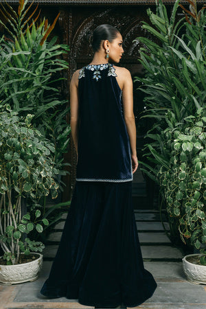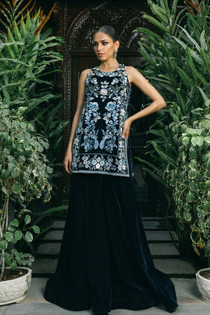 Winter festivities are incomplete without the timeless glamour of midnight hued velvet. In Noa a pearlescent neckline makes way for a straight fit shirt and a cascading dhaka pajama, evoking an indulgent visual experience. The resham embroidery, inspired by botanical gardens, in various hues of azure and sage adorns the entire shirt, elevated by cut-work details accenting the shoulders.