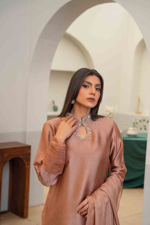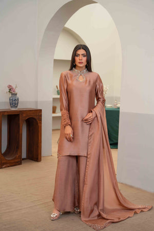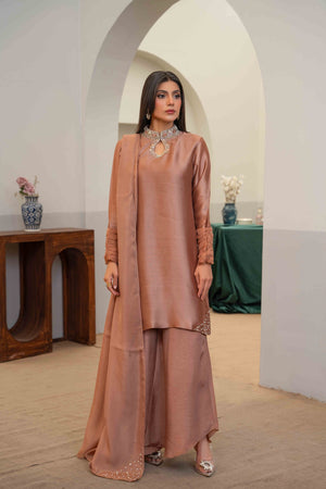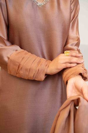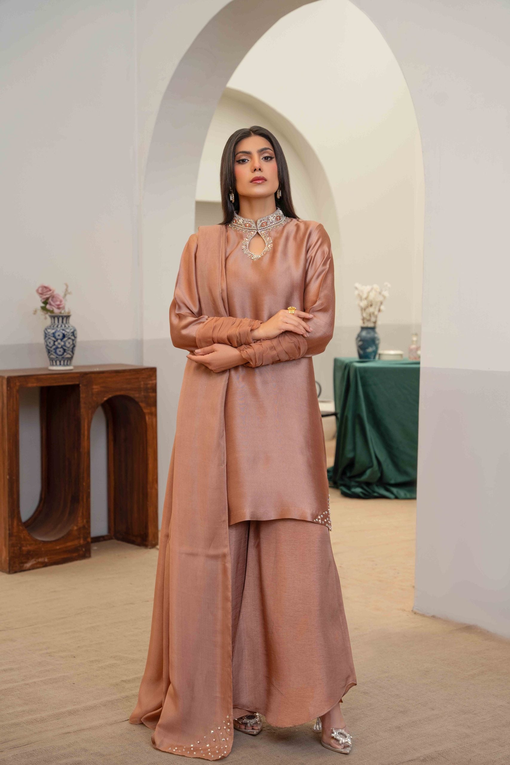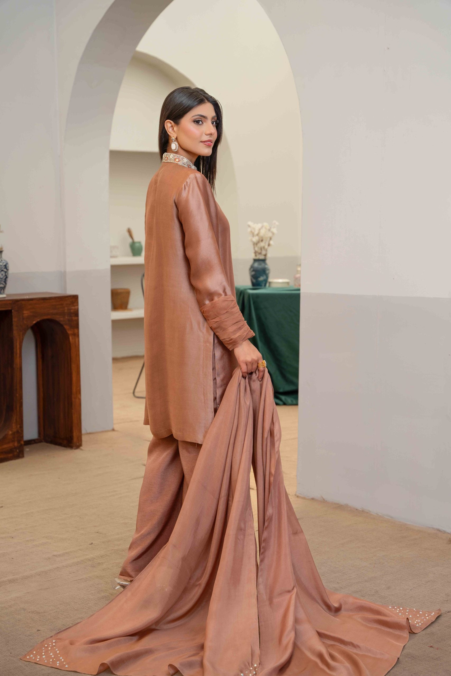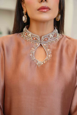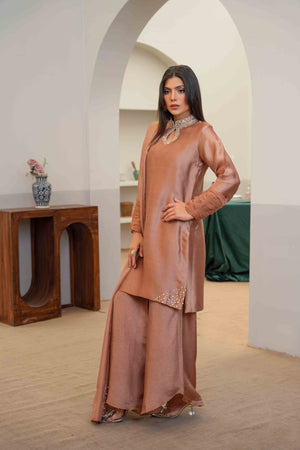 Noele showcases the vibrant charm of brown, a color synonymous with freshness and sophistication the thoughtful detailing on neckline and cuffed organza sleeves styling, paired with these stylish flared trousers adds a contemporary flare while maintaining an air of elegance.
