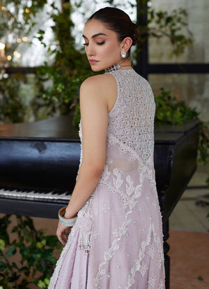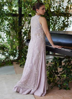 Romantic, refined, and beautifully detailed — this dusty pink schiffli jacket set is a celebration of soft elegance and artisanal craft. The jacket is delicately hand-embellished with clusters of pearls, Swarovski crystals, and intricately formed 3D flowers. Fine cutwork adds texture and dimension, while the front-open silhouette reveals a hand-embellished bustier for a modern layered look.