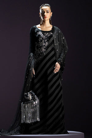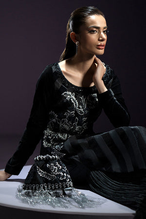 Draped in the elegance of obsidian allure, 'NOIR' in black color resonates with dramatic grace. Dazzling silver floral embellishments adorn this outfit, adding a touch of subtle sophistication and making it a perfect ensemble for evening soirees. The ethereal charm of silver sequins on the net Mukesh dupatta catches the light, casting a spell of enchantment. Complete the look with embellished bag and crushed trousers for a seamlessly chic and refined appearance.