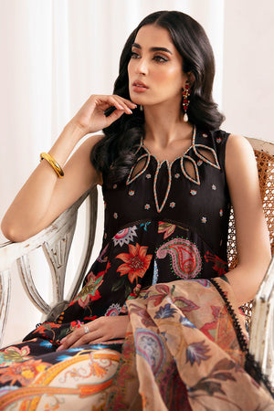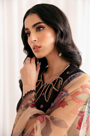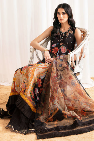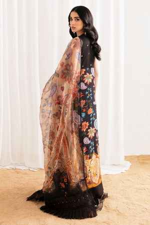 Refined prints created in-house are impossible to resist. A deep onyx hue, with eye catching pop colours further enhanced with hand embellishment. Featuring long chaak with tassel and lace detail paired with Sharara and printed organza dupatta with organza frill and beads detail.