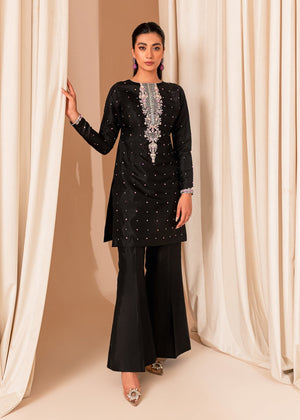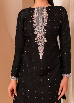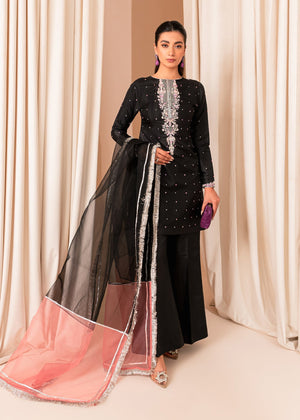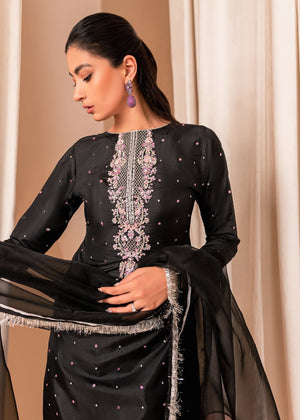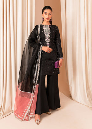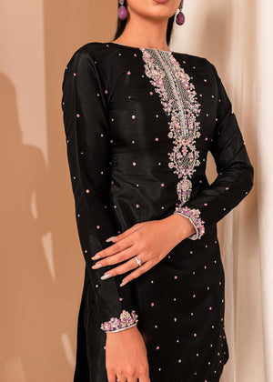 A graceful black silk set, it is balletically embellished on the neckline with nakshi, sitara, dabka and cutdana in beautiful hues of pink and silver. It comes with an color block organza dupatta and bell bottom pants.