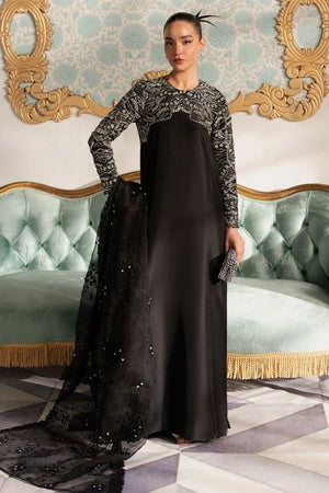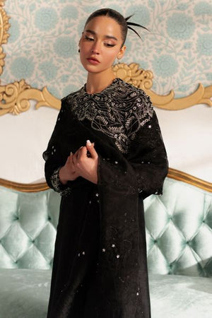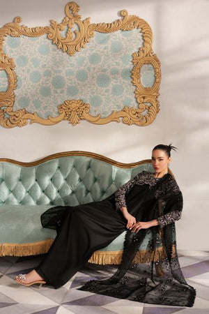 This modern, elegant ensemble features a sleek black shirt adorned with intricate silver embellishments and a contemporary embroidery pattern that stretches across the chest and sleeves. The embroidery, with flowing curves, catches the light with every movement, offering a striking contrast against the dark base. The shirt is paired with simple, tailored black trousers for a clean, streamlined silhouette. Completing the look is a unique dupatta, create a subtle yet glamorous outfit