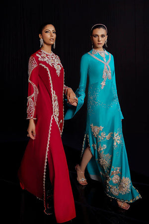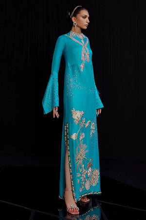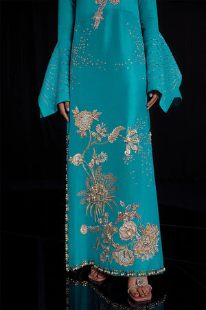 Body cut long dress in turquoise color in pure raw silk. It has tilla and resham embroidery with detailed hand embellishment. Sleeves are unique and exuberant in cut with embellishment. Long side slits which can be reduced on demand too.