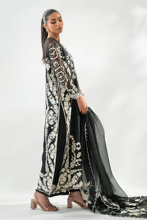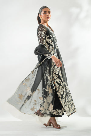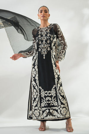 'A long charcoal hued organza shirt is rendered with our signature aari embroidery all over. Paired with a matching organza dupatta adorned with appliqued floral motifs and scalloped borders. Matching rawsilk trousers complete the look.