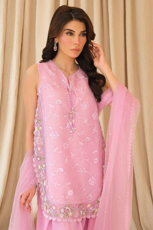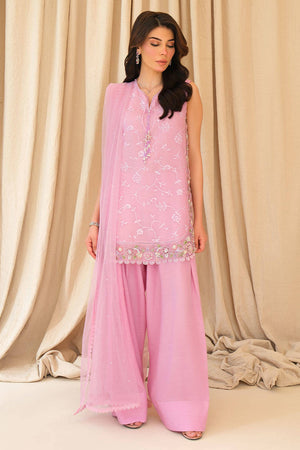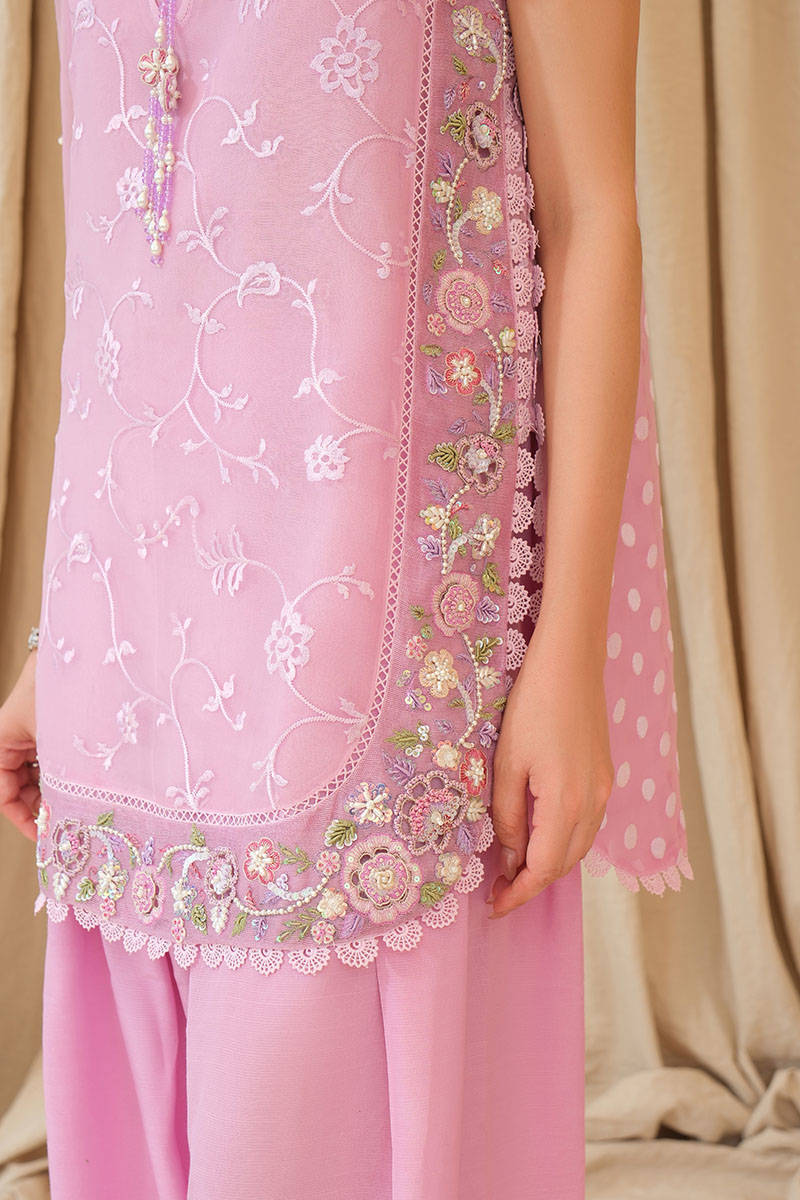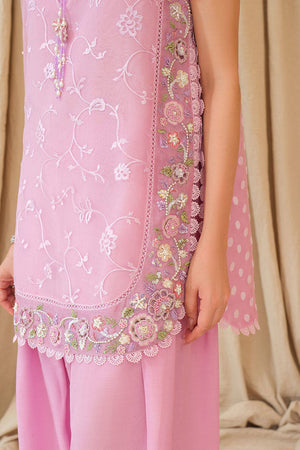 Delicate and radiant, Noorani is crafted in embroidered organza, adorned with intricate handwork featuring resham florals, pearls and pastel sequins for a soft shimmer that catches light with every movement. Paired with a trending elvish silk farshi shalwar for regal flow and a hand-embroidered net dupatta, this lilac ensemble is the essence of feminine grace—fresh, festive, and effortlessly dreamy.