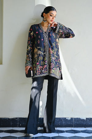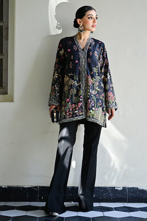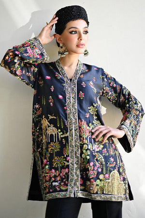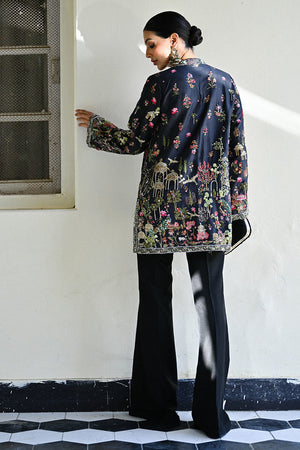 A striking black short jacket adorned with intricate hand-embroidery, showcasing traditional Kashmiri Kalamkari-inspired motifs. The design features regal Mughal minarets and graceful peacocks, adding an exquisite, heritage-rich charm. Paired seamlessly with classic raw silk bootcut pants, the ensemble blends cultural artistry with contemporary elegance.