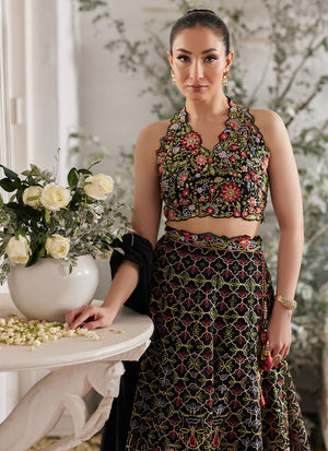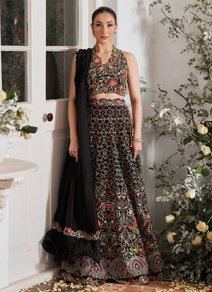 The Black lehenga choli is the most perfect twirl worthy ensemble. The organza choli is adorned with vibrant coral and pink flowers, further up lifted with beautifully done hand embellishments.