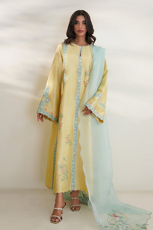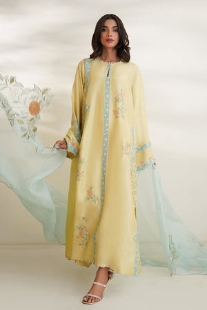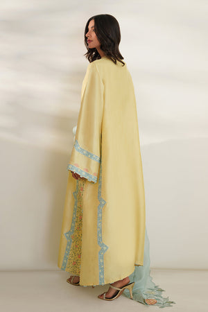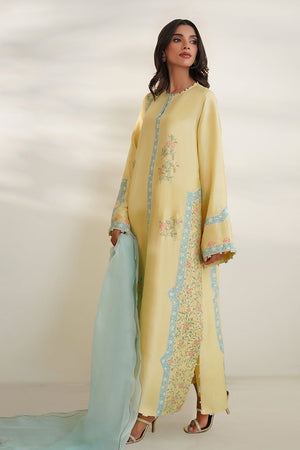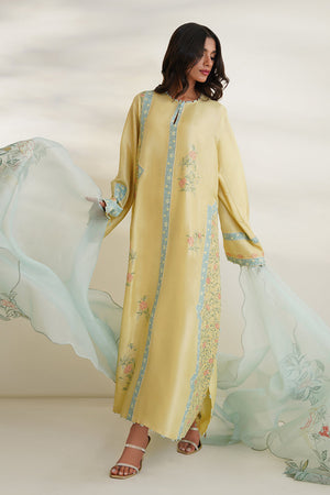 'A pastel yellow tunic cut from pure rawsilk is delicately adorned with floral embroidery. Paired with an elegant powder blue organza dupatta with scalloped edges and appliquéd accents. Complete the ensemble with matching rawsilk culottes.