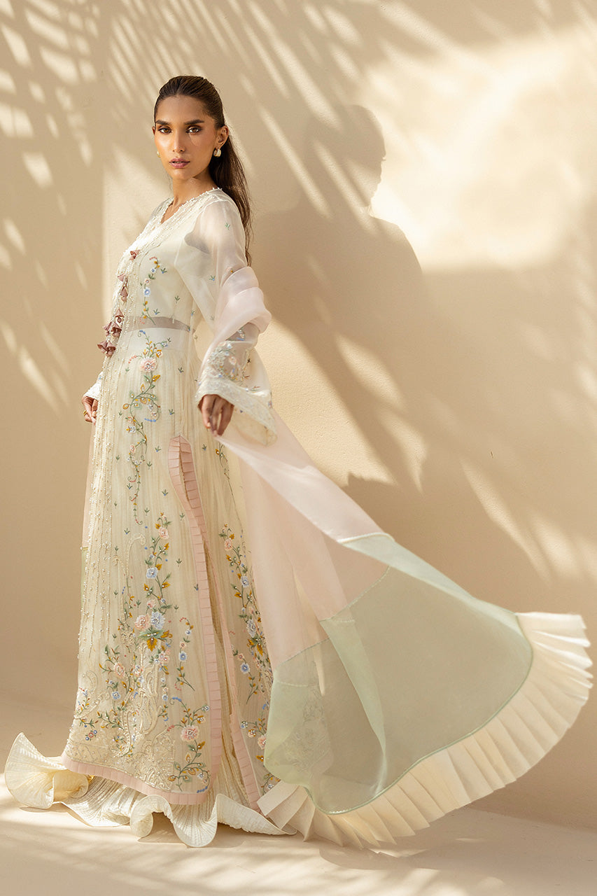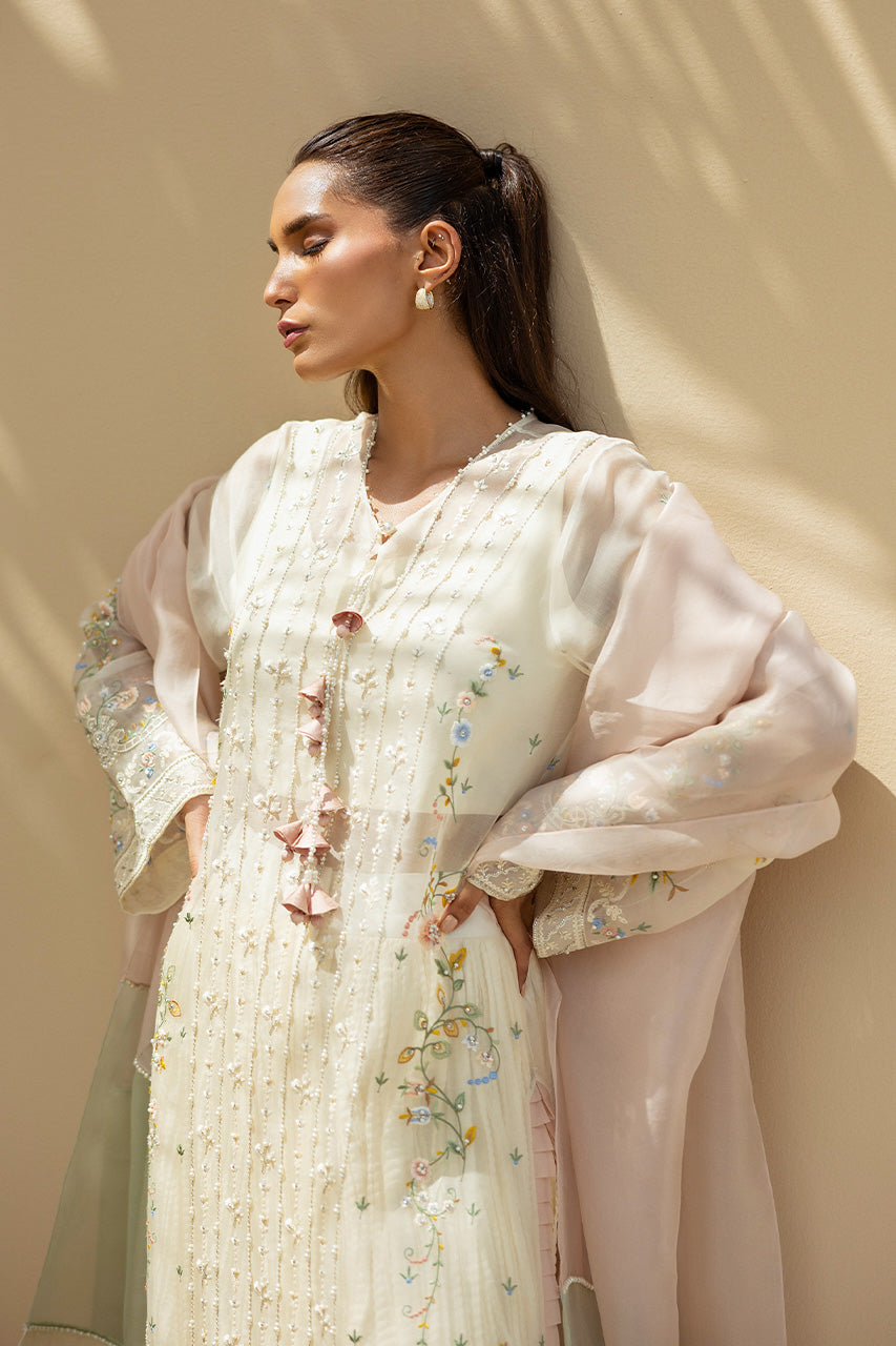 Awash in luminous ivory tones, a sheer A-line shirt is embellished with intricate floral threadwork, sequin accents, and handcrafted tassels that cascade along the front. Paired with a pleated crushed skirt that falls in graceful swirls and a diaphanous two toned dupatta, it creates an ethereal statement.