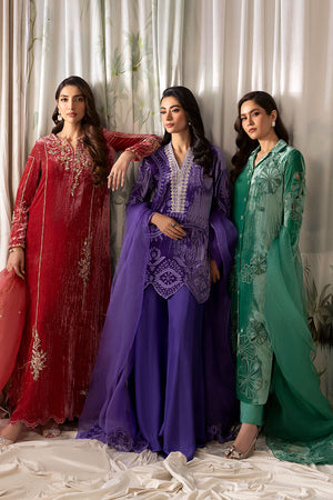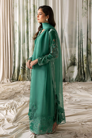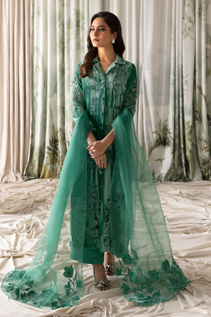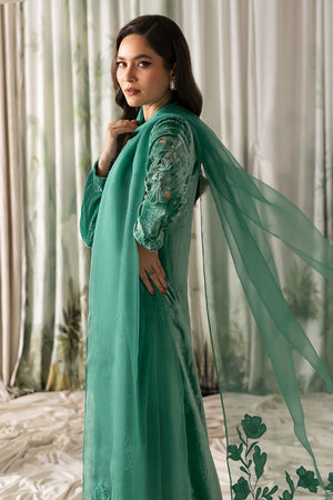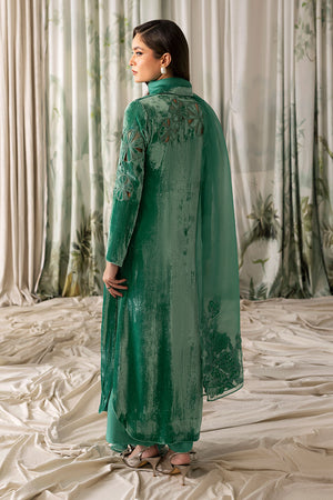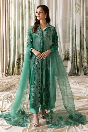 A very chic look in pure Sea green velvet front open shirt. It is beautifully adorned with cutwork motives in front, back and sleeves motif.