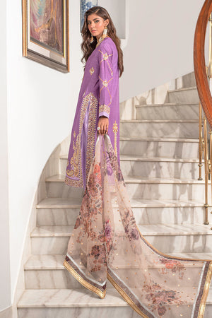 A straight mauve-colored shirt with silver and gold traditional Zardozi work, paired with a printed organza dupatta, creates a beautiful and balanced ensemble.