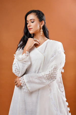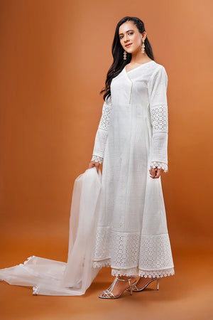 Look spectacularly graceful and elegant in our white kalidar which is in Chifley fabric paired with white organza dupatta , This is definitely going to be your first choice to wear on Eid.