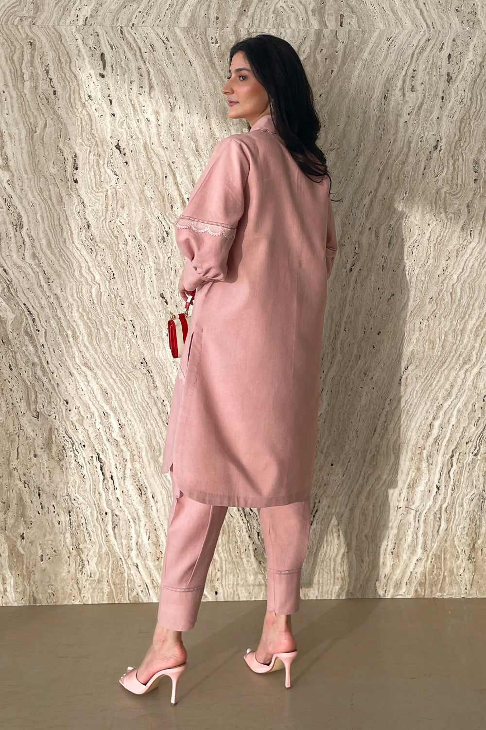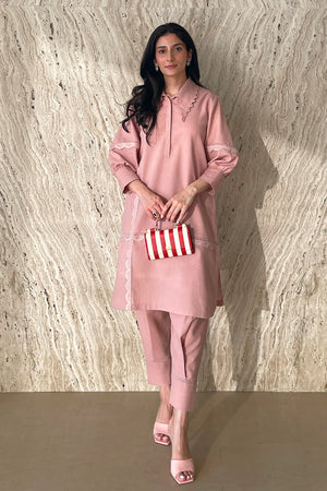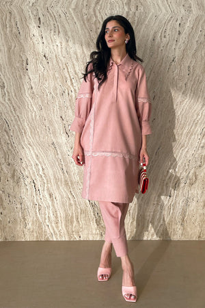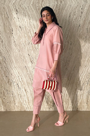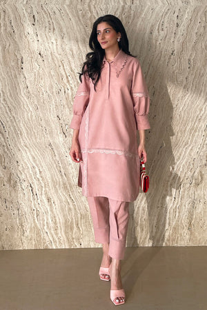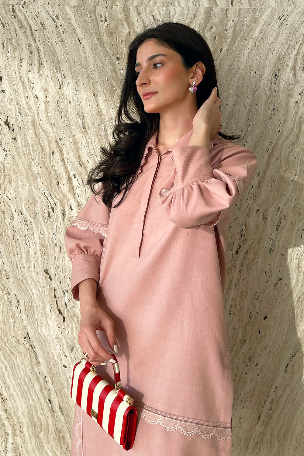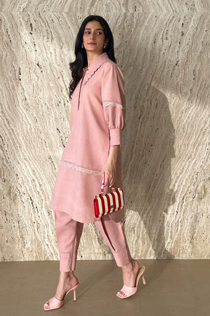 Fall in love with our Powder Pink Cotton Nura Set. Whimsical collar, lace details, and a matching pleated shalwar make this set a forever favorite. Buy now and treasure for seasons to come.