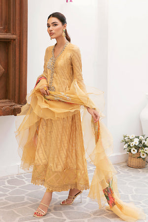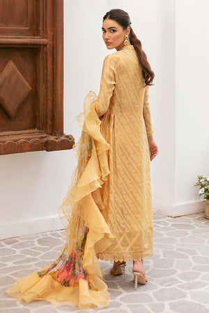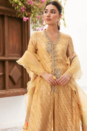 Mustard Self Cotton net front open style shirt. It is enhanced with hand embroidery in front. Daman has organza design with lace.