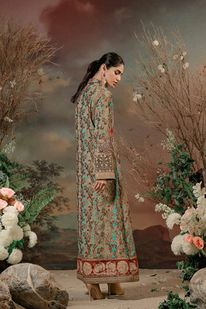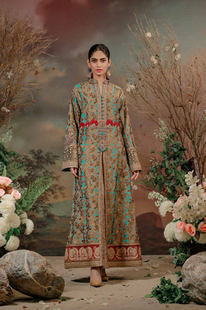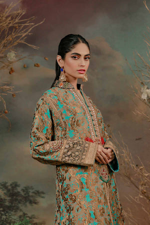 Ethnic shamaeel silhouette.rendered in blissful ferozi tones with bold ottoman inspired running pattern in antique tila thread work on the silk fabric accompanied with contrasting colored intricate borders . delicately hand crafted zardozi,ari,resham and tila thread,original stones and pearls work on the gallah to give the dress a beautiful royal feel.Collection: Guzel Eid Collection 2021