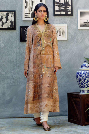 Free style traditional original Shamaeel kurta silhouette. A richly detailed design featuring a blend of floral and geometrical original Shamaeel print. Delicate hand stitch work in mint green and coffee resham thread, antique gold tila craft on a vintage print canvas. beautiful intricate hand crafted neckline designed by using sequence work, antique gold beads, copper original stones and resham thread.Collection: Saaz Luxury Wedding Wear