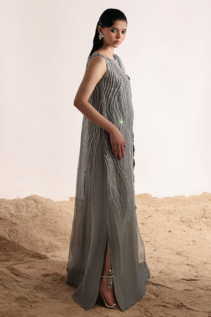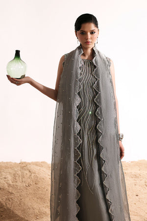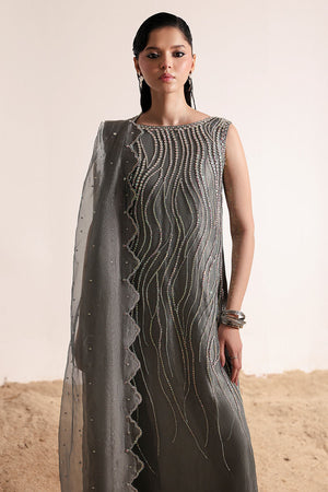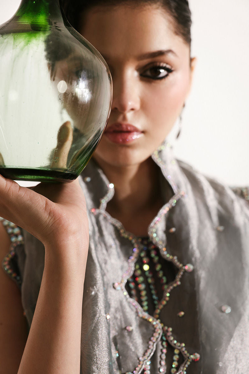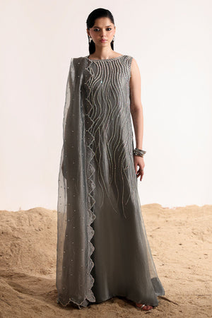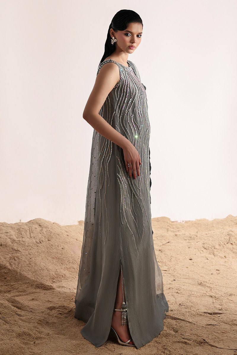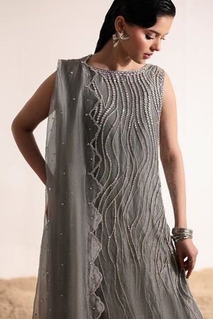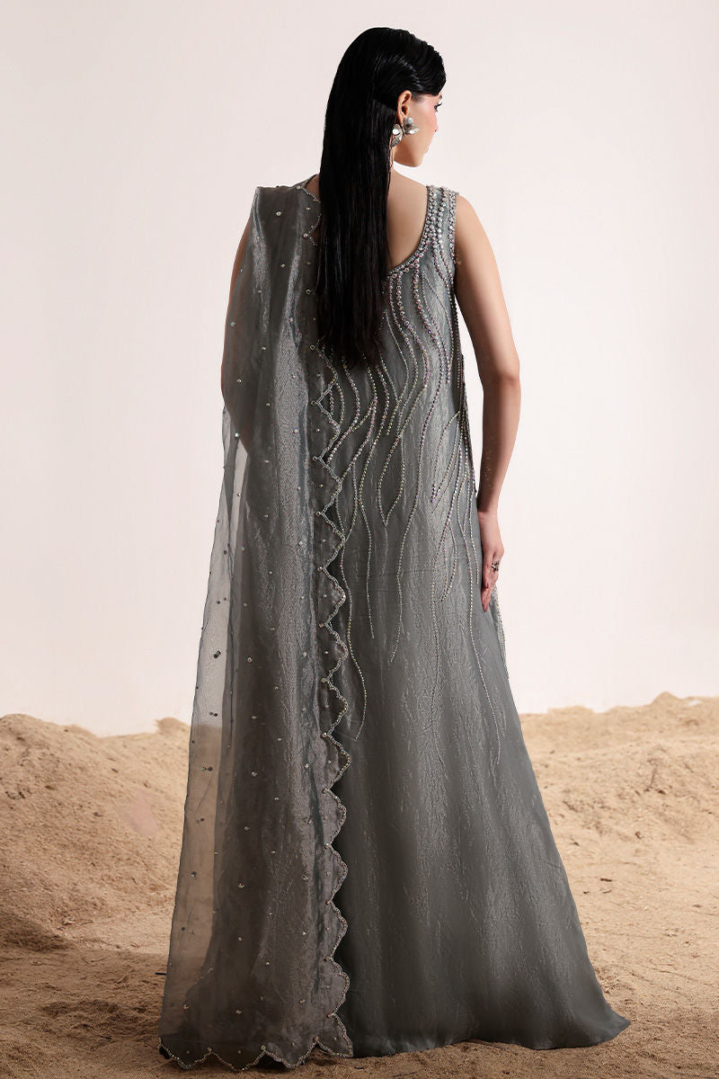 A sophisticated grey attire in Silver Indian Tissue, designed with a classic shirt and matching dupatta. Its subtle shimmer and refined detailing make it a perfect ensemble for graceful occasions.