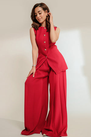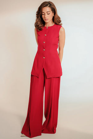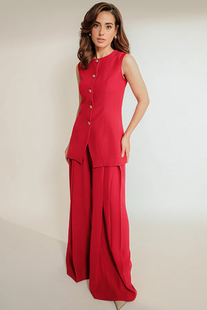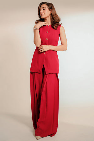 A co-ord set with a touch of whimsy, Nyra is an effortless combination of a slim fit button down vest and flared pants. Crafted from a deep crimson hued Italian crepe, the minimal round neckline is paired with gold statement buttons, making way for the exaggerated silhouette of the pleated trousers.