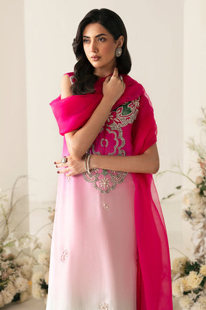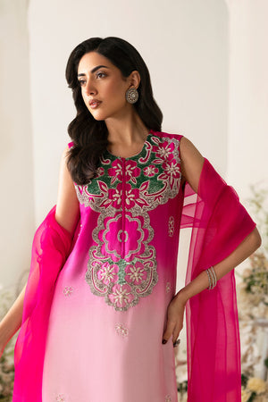 An eye catching straight long shirt features a stunning shocking pink to sea green ombre effect. The neckline is beautifully detailed with hand embellishment. It is paired with pure organza dupatta with work on corners.