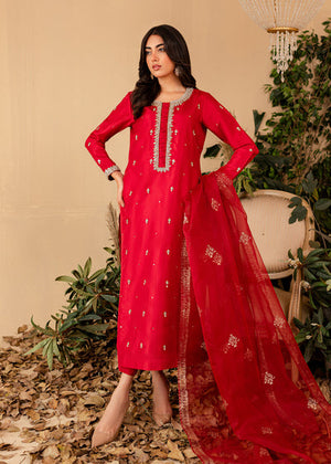 A vibrant red is offset to a sumptuous cherry, features an elongated shirt adorned with intricate bead work beautifully crafted leaf motifs with hints of sliver, light gold and pearls. Comes with a soft sheer dupatta, block printed borders and foral motif spray. This gorgeous shirt is paired with tonal trouser make an impact in this classic timeless piece on you.