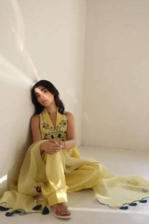 A lemon hued ensemble redefines elegance with its flattering silhouette. The pure rawsilk sleeveless shirt features delicate pleats and intricate floral embroidery, evoking artisanal charm, while a bold front slit adds a contemporary edge. Paired with a voluminous pure rawsilk farshi shalwar for effortless movement, the look is completed with an organza dupatta, adorned with scalloped edges and appliqué florals in deep sapphire tones.