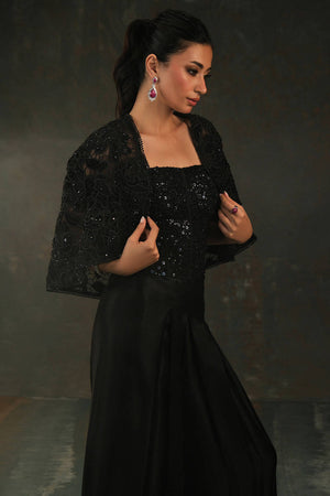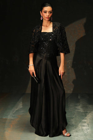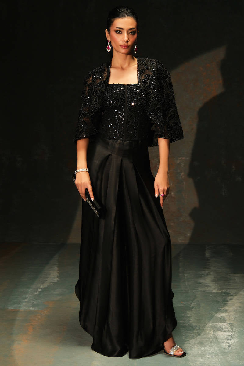 Elevate your evening style with this striking black ensemble, featuring a hand-embroidered velvet-appliqué jacket paired with a sequined and crystal-embellished bustier. The pure satin pleated skirt-pants offer graceful movement with a modern edge, creating a look that is both timeless and powerful. Effortlessly glamorous and refined, this outfit is designed to make you feel confident, polished, and unforgettable.