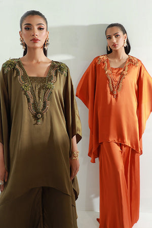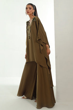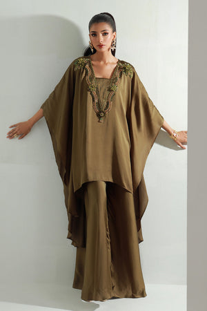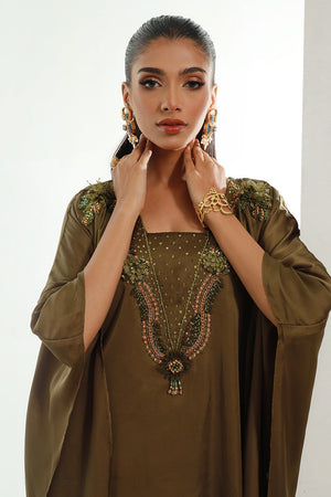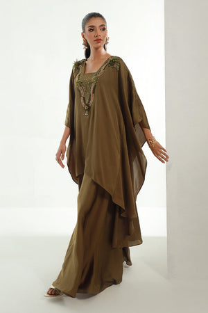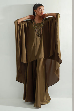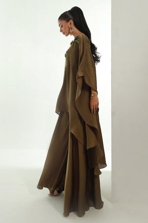 Crafted from luxurious chemouse silk in a captivating olive green shade, this flowy cape is a true head-turner. Its high-low cut design sets it apart as a statement piece, embellished with exquisite handwork featuring 3D flowers, Kora, pearls, and stones. The ensemble is elegantly completed with flared pants, making it an absolute essential if you aim to make a standout impression in any crowd.