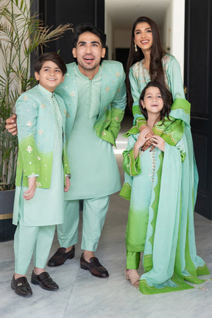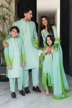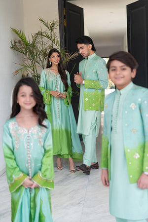 A perfect blend of grace and glamour, Serene Aura is crafted in a mesmerizing ombre green, embodying elegance in every detail. The long front-open shirt is adorned with intricate bead, crystal, and stone embellishments on the neckline and sleeves, adding a touch of refined brilliance. Delicate tassel hangings on the front create a fluid, enchanting movement with every step.