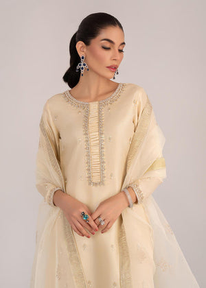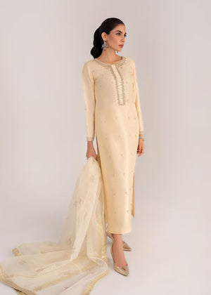 This graceful solid Ivory Katan silk set is exquisitely designed to create an elegant look. It is delicately embellished with dainty white pearls, golden sequins, cut dana, pearls and stones. Paired with an Block printed organza dupatta to complete the look!