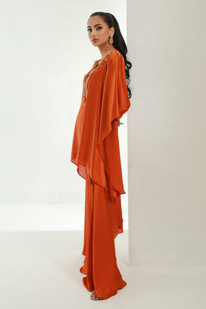 Crafted from luxurious chemouse silk in a captivating rust orange shade, this flowy cape is a true head-turner. Its high-low cut design sets it apart as a statement piece, embellished with exquisite handwork featuring 3D flowers, Kora, pearls, and stones. The ensemble is elegantly completed with flared pants, making it an absolute essential if you aim to make a standout impression in any crowd.