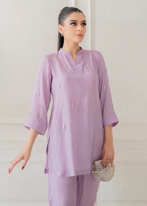 Orchid, the shirt boasts a sophisticated neckline with multicolored Swarovski crystals sprayed all over, paired with a sleek shalwar to create a cohesive and polished look.