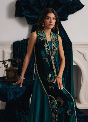 Luscious velvet with that irresistible sheen, a stunning burst of glimmering gold sequins and silk thread work in emerald and teal all over the shirt make you instantly dressed up.