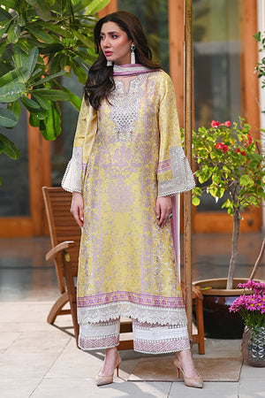 This lime-hued long shirt boasts a hand-embellished neckline adorned with cutdana, sequins pearls with organza embroidery on the sleeves and delicate lace enhancing the hem and side seams. Paired with raw silk pants featuring a printed border and lace accents, and a luxurious crushed color-block silk dupatta.