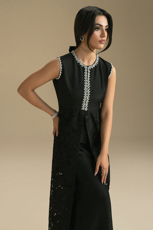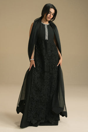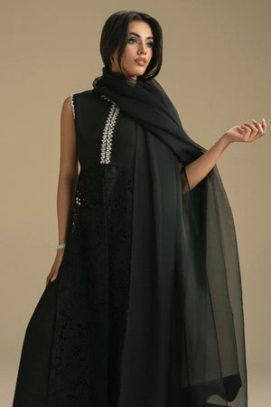 A modern black ensemble defined by understated elegance and bold detail. The long shirt features intricate cutwork panels and a strikingly embellished neckline crafted from contemporary silver-toned materials.Paired with sleek flared pants accented in silver for a touch of edge. The look is completed with a sheer organza dupatta, adding graceful fluidity to this refined and fashion-forward piece.