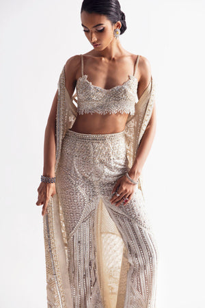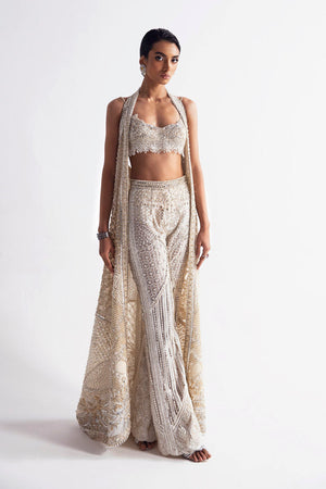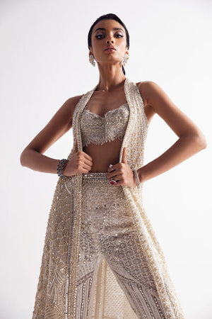 The ensemble marries extravagance and sleek refinement in a symphony of style. At its heart lies the embellished jacket, a true masterpiece that commands attention and radiates opulence like no other. The jacket is a work of art, meticulously adorned with intricate embellishments that catch and reflect the light, creating a dazzling spectacle with every step you take. Paired with this awe-inspiring jacket are pants that continue the theme of opulence. The pants are a vision of glamour, embellished with sequins and delicate floral embroidery that echoes the sophistication of the jacket. With every stride, the sequins catch the light, creating a cascade of sparkle that adds an extra layer of allure to your ensemble. The bralette, fully embellished and designed to resemble glistening crystal drops, completes the ensemble with a touch of enchantment. Its intricate details add depth and dimension, enhancing the overall effect of the outfit. The design of the ensemble exudes confidence and allure, making a statement that is both bold and captivating.