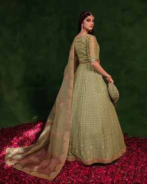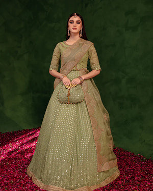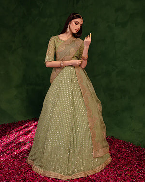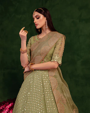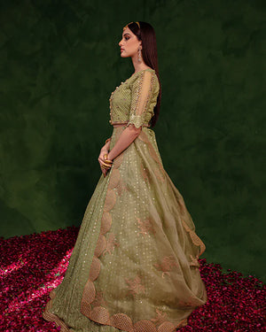 A festive day seems incomplete without a lehnga, and what’s better if it is detailed with pretty mirror work?Get your hands on Paras, our bestseller from the latest luxury collection that will complete your formal look. The organza dupatta embroidered with tilla work and jacquard green blouse with dabka, tilla, sequins, swarovski & pearl work creates an overall dreamy look.