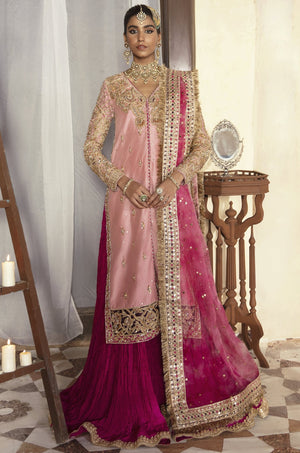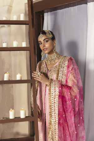 The tinges of pink are sworn in a romantic affair in this fancy ombré ensemble. Florid handwork of gold hue heavily detail the neckline and the hem of the dupatta on a rose and tea pink fabric.The shipping charges for all articles barring Bridals are as follows: