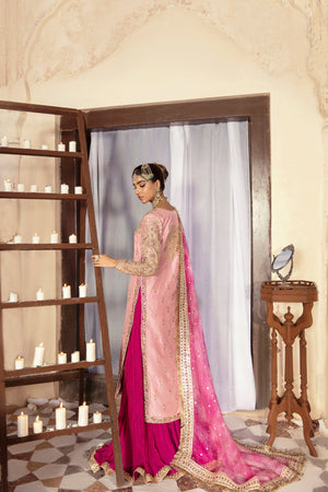 The tinges of pink are sworn in a romantic affair in this fancy ombré ensemble. Florid handwork of gold hue heavily detail the neckline and the hem of the dupatta on a rose and tea pink fabric.